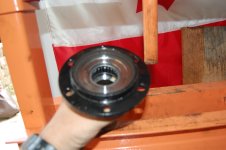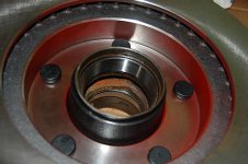 Today we will cover assembling the rotor to hub. First Iwill press the new races into the hub. Hold on to your old parts, they will come in handy. I've cleaned the inside of the hub from overspray with a"scotch pad" and put a light coat of lithium grease on the inside ofthe hub and new race. We will start with the inside of the hub.