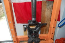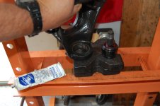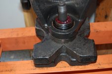 First, use a press arbor plate on the top and bottom to start the race. Next, I'll use the old bearing race on top of the new one to press intoplace. Be careful of binding, stop if parts are not square.