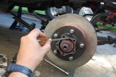 Now I cleaned up the extra grease and looked for binding or miss-alignment. In order to press the hub on to the rotor, I used new studs(but that is up to you). I started with two studs on opposite sides (I greasedthe threads only) through the rotor into the bearing. Turn the suds slightly until you feel them align with the stud groves in the hub housing. Next I applied lug nuts and tightened them slowly with a impact wrench.
