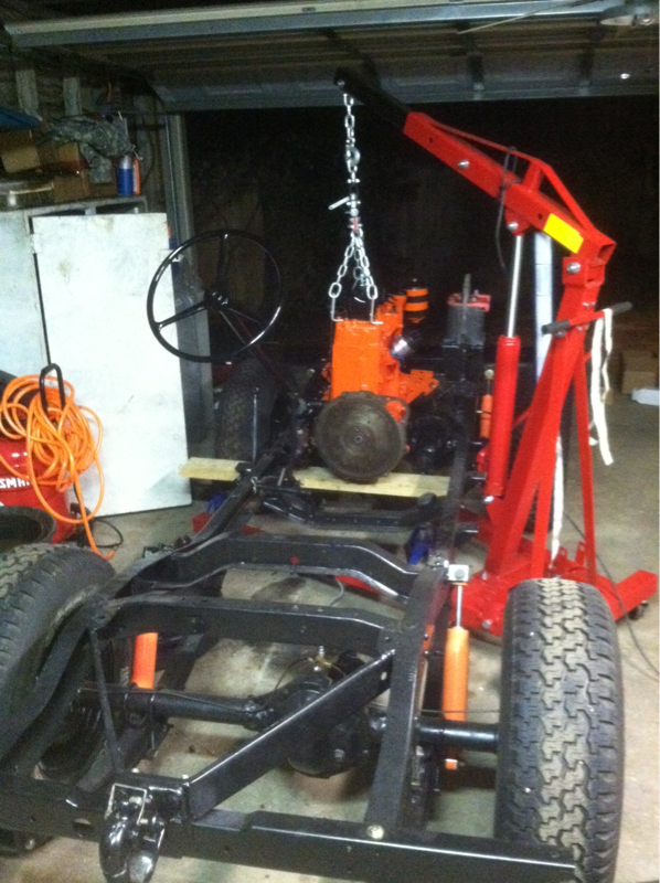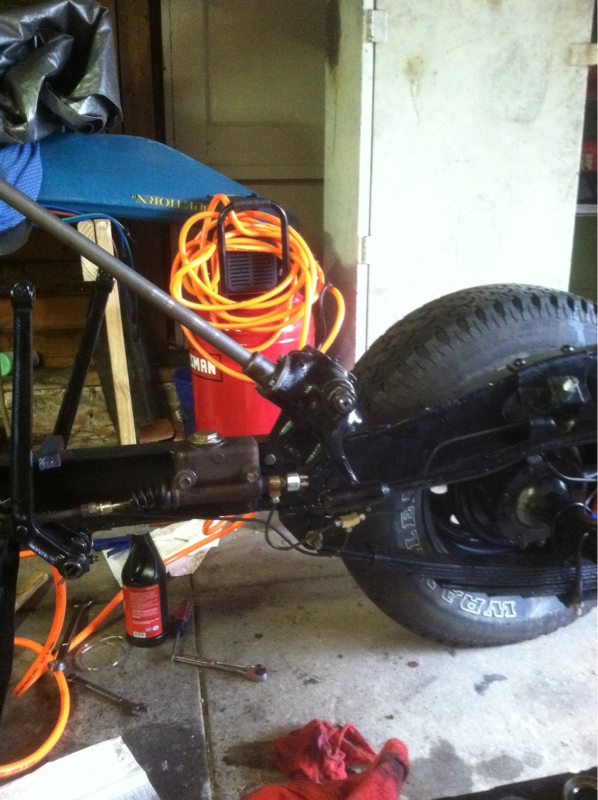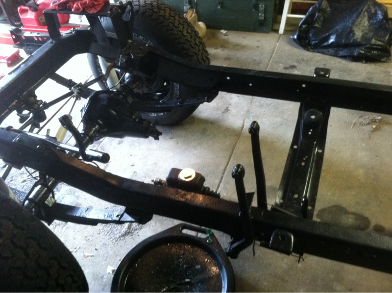 I installed the rear crossmember today. It still needs a final coat of POR-15. I bolted on the steering box in preparation to install the steering column this week. Also, I bled the brakes and they work perfectly. Still waiting on the engine to come back from the machine shop.