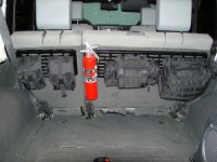 Mount a small fire extinguisher to the transmission hump and a larger one in the rear. As for your shovels and such mace a custom bracket that allows them to mount on the side of you stock luggage rack. That way you could still put your canoe up there.