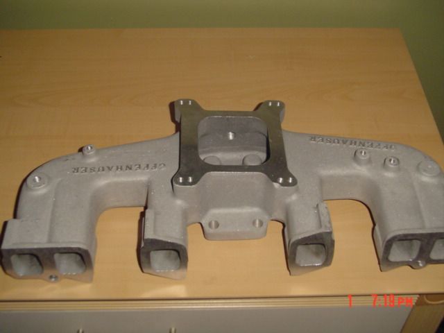 this is what my spacer and intake look like. the spacer is 1" tall because without it, the arm on the carb hits the intake. the carb sits with the throttle linkage on the firewall side but i would like to turn it so its facing the driver's side fender. this will allow me to hook my shift linkage back up.