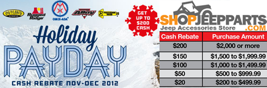 Simply purchase Rugged Ridge®, Omix-Ada®, Alloy USA®, Outland®, ORV® or Precision Gear® products on a one time order from November 1 - December 31, 2012, and get a cash rebate directly from Omix-Ada! The more you buy the bigger the rebate.