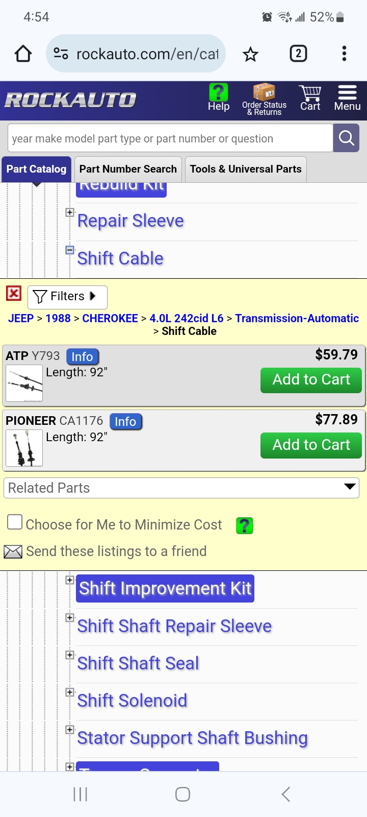 From what I understand is my 1988 Jeep Cherokee Laredo 4 x 4, 4.0, 6 cylinder has a AW4 transmission ? My kick down cable is shredding and I have had to park it until repaired.I went to 4 auto parts stores only to have them tell me I do not have a kick down cable, but a lever of some kind. I finally got one of the employees to agreed to see the one like mine on his browser. He agreed I have a kick down cable , TV cable etc. He also tells me that I will have to order it online. I have gone to Pioneer and looked at a number of them. My jeep has an adjuster on one end (cable) a plastic thumb size you push in and use your kick down button/pedal to adjust from inside the jeep. I have followed the cable which is inside a tube of rubber over my transmission but I am not sure if I have the correct area. I can not find exactly the length I see 25.7 in, 47 in etc. Can some one guide me to fix my issue. My Jeep may have been built in Canada.