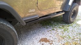 My recently bought daily driver LJ has 62k miles and most recent upgrade is Detour USA drop kick sliders $350 shipping included. It has Kenda 33-12.5-15 at tires, 4.5" rough country lift, factory style 6" extended Crown auto fender flares ($160 on Amazon), Opar grab bar entrance handles $40 on Amazon,in channel window vent shades and quadratic molded floor mats. I've changed both axles housing oil out for quality synthetic, changed transmission oil, transfer case oil and coolant. I put new much needed spark plugs in. (surprised how worn and out of speck factory plugs were at 58k miles) so the recommended 30k mile plug replacement is no joke if using factory ngk plugs. I plan on daily driving my LJ until about 90k miles is reached and then starting on upgrading gears, heavier duty front end components/maybe axle and lockers. As for the Detour sliders, they installed in 25 minutes. That includes time gathering tools. They easily mount to frame and only require one slight adjustment to a plastic spacer that holds gas lines and break lines to frame. They are solid and come with primer only so that you can paint with any brand you choose which makes touching up with exact matching paint a breeze. I chose rustoleum semi gloss enamel. The only negative aspect to detour usa can also be a positive. His shop is small. He can only build after you order and on top of that he is at the mercy of his steel supplier who will only ship his steel orders once every type of steel ordered is in stock. My order took almost 3 months to arrive. That is at least one month more than normal for him but I wanted to give a honest review and the stars aligned to cause my order to take this long. I'm very happy with them and WOULD order again knowing it could possibly take this long (his normal is around 8 weeks). He is very nice and personally answers the phone! Anyways here is some pics